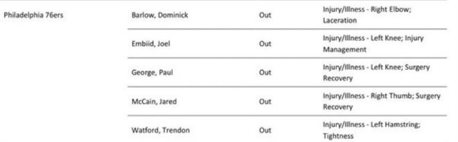 除此之外,76人還有其余4位球員無緣對(duì)陣魔術(shù)的比賽,喬治、麥凱恩與沃特福德依然是持續(xù)因傷高掛免戰(zhàn)牌。